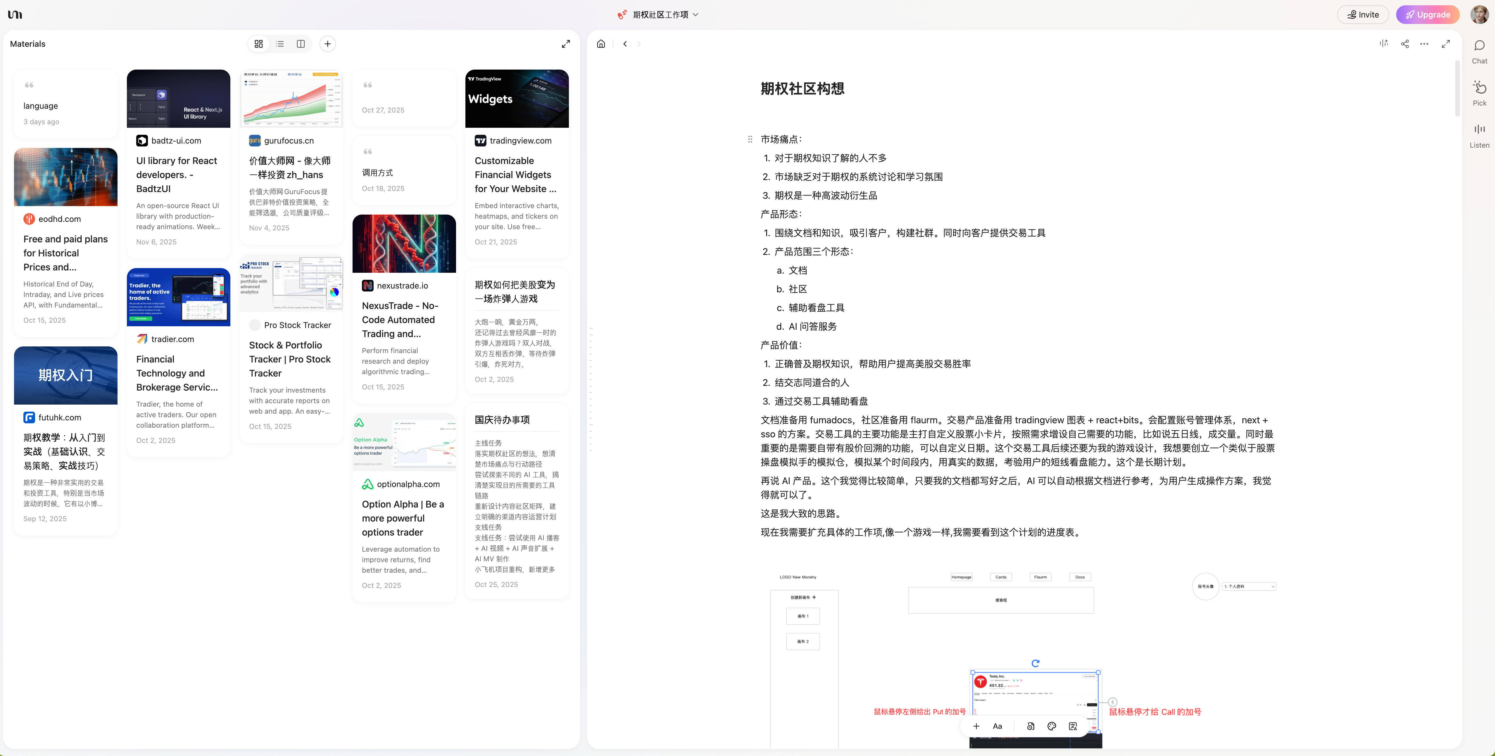 Plus, information is very diverse—screenshots, PDFs, even videos or audio recordings. These fragmented materials, combined with a moment of enthusiasm, might bring you substantial returns. Traditional note-taking software can't really carry all this information, but a canvas can. Free dragging and dropping naturally forms unique arrangements and combinations of information knowledge. Language and DNA are both forms of arrangement and combination, and so is a canvas. Therefore, I had a rough product prototype concept: