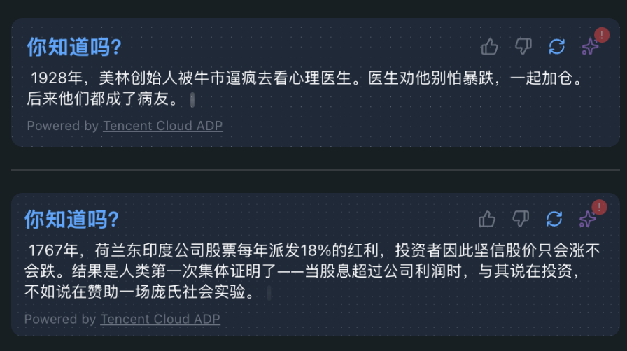 Oh, considering the entertainment value of the project, I also created a "Financial Sarcasm" intelligent agent application that specifically outputs hot takes, stories, and dad jokes from the financial market. Yes, I love dad jokes, helping you cool down in a hot market. Being able to laugh in a cold market. After all, no matter what happens in the market, my friend, always maintain a love for life.