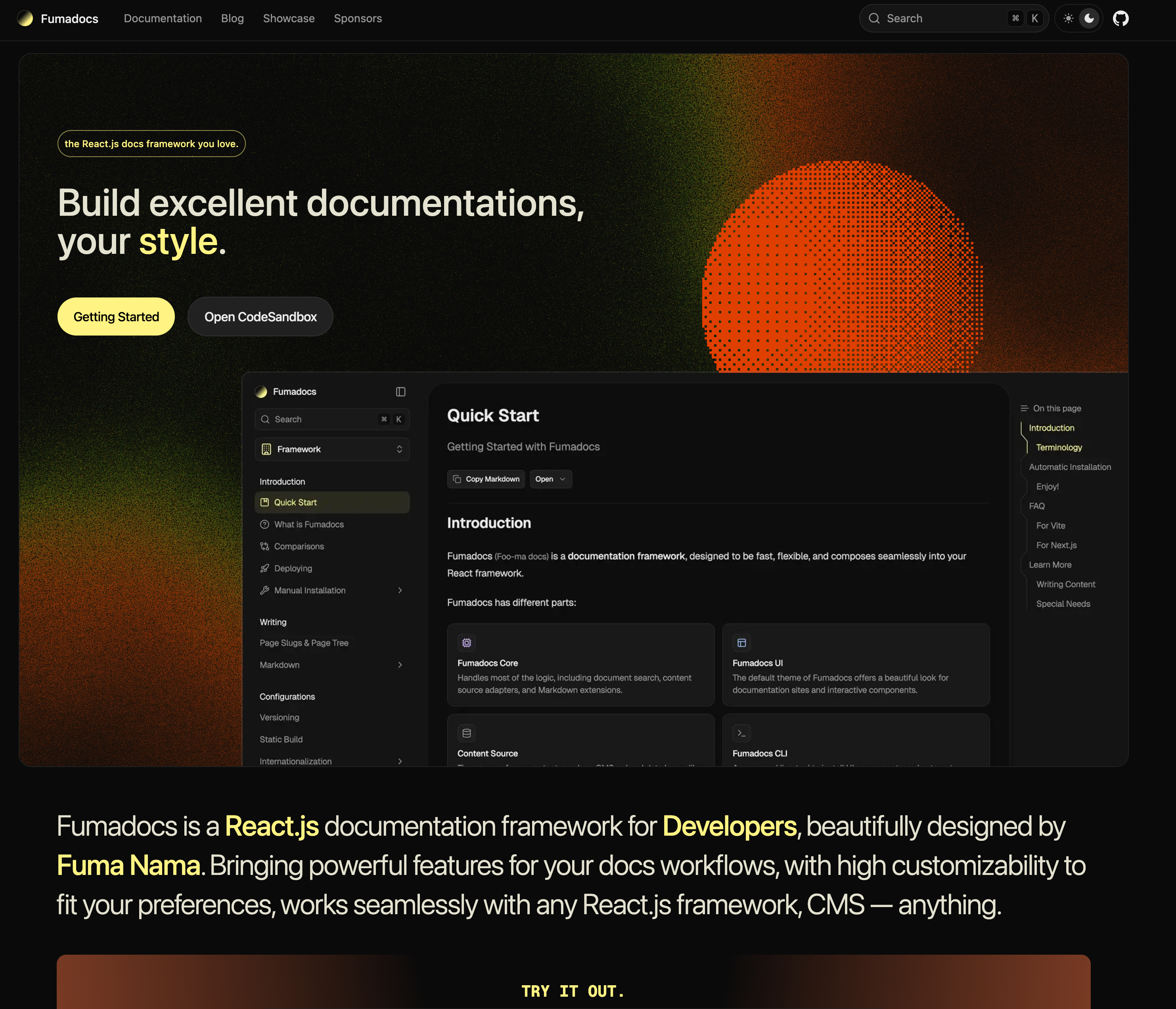Documentation page uses Fumadocs. Experience link: https://fumadocs.dev/