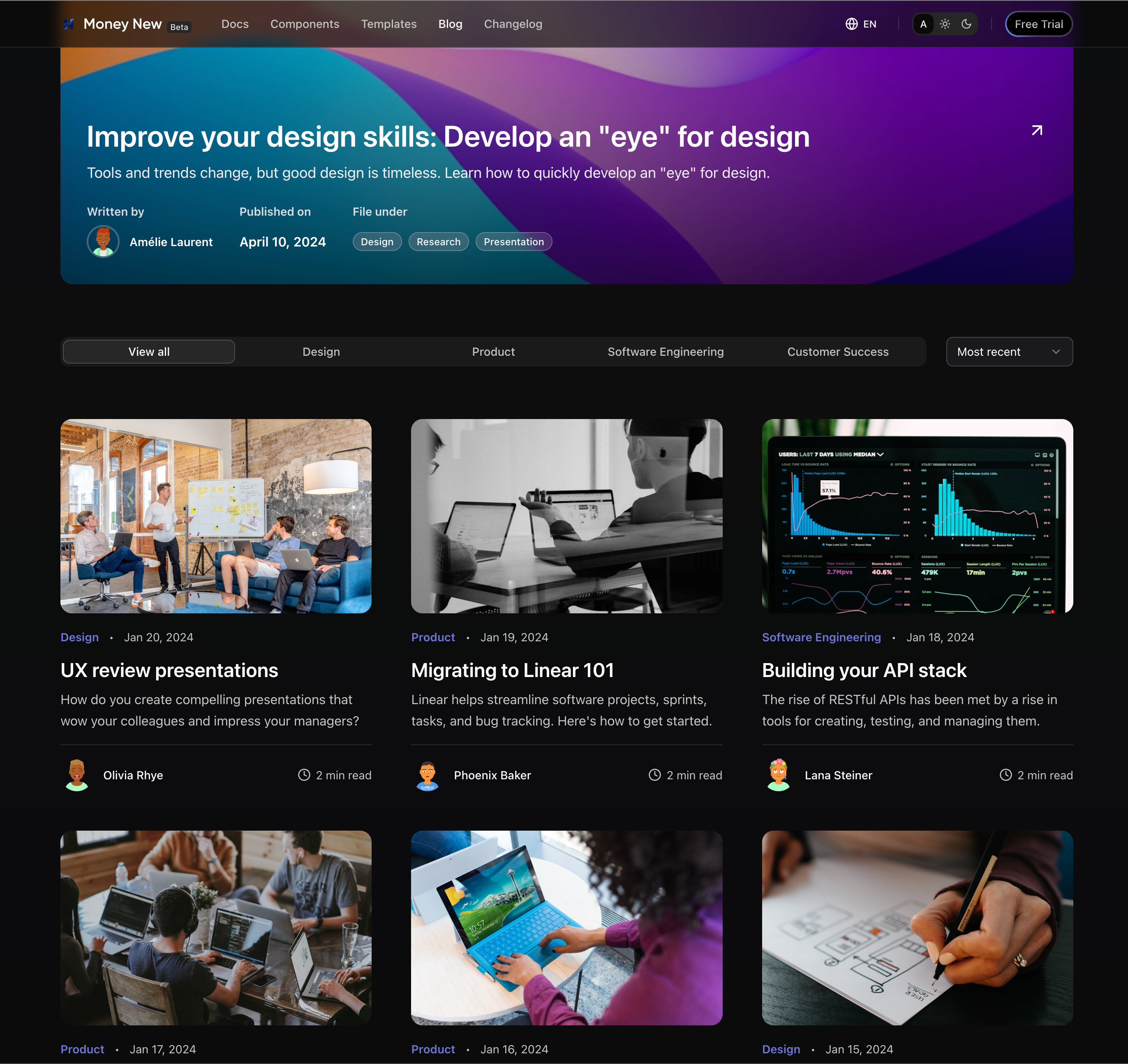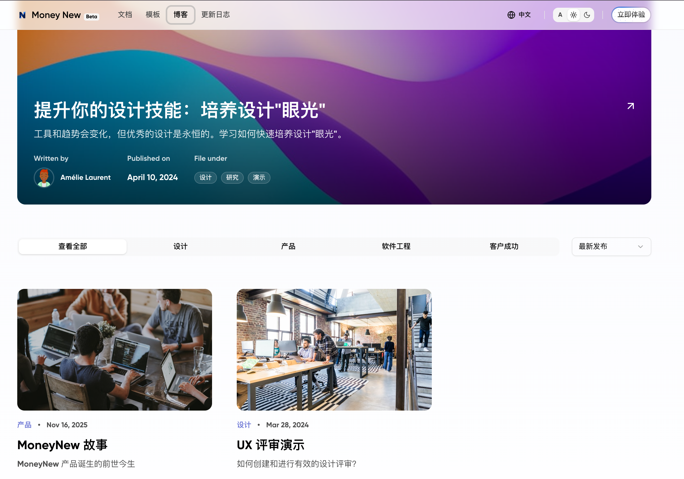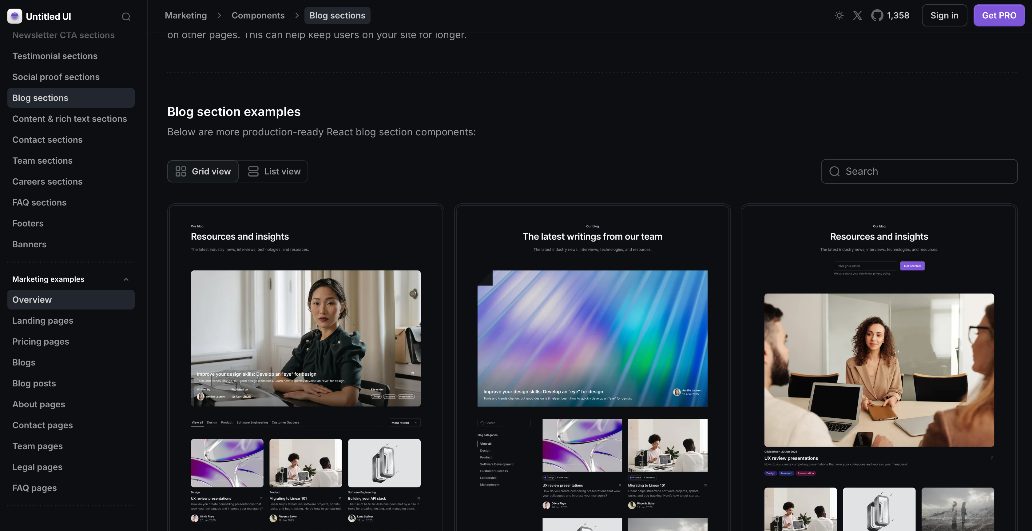 Blog page uses Untitledui. Experience link: https://www.untitledui.com/react/marketing/blog-sections