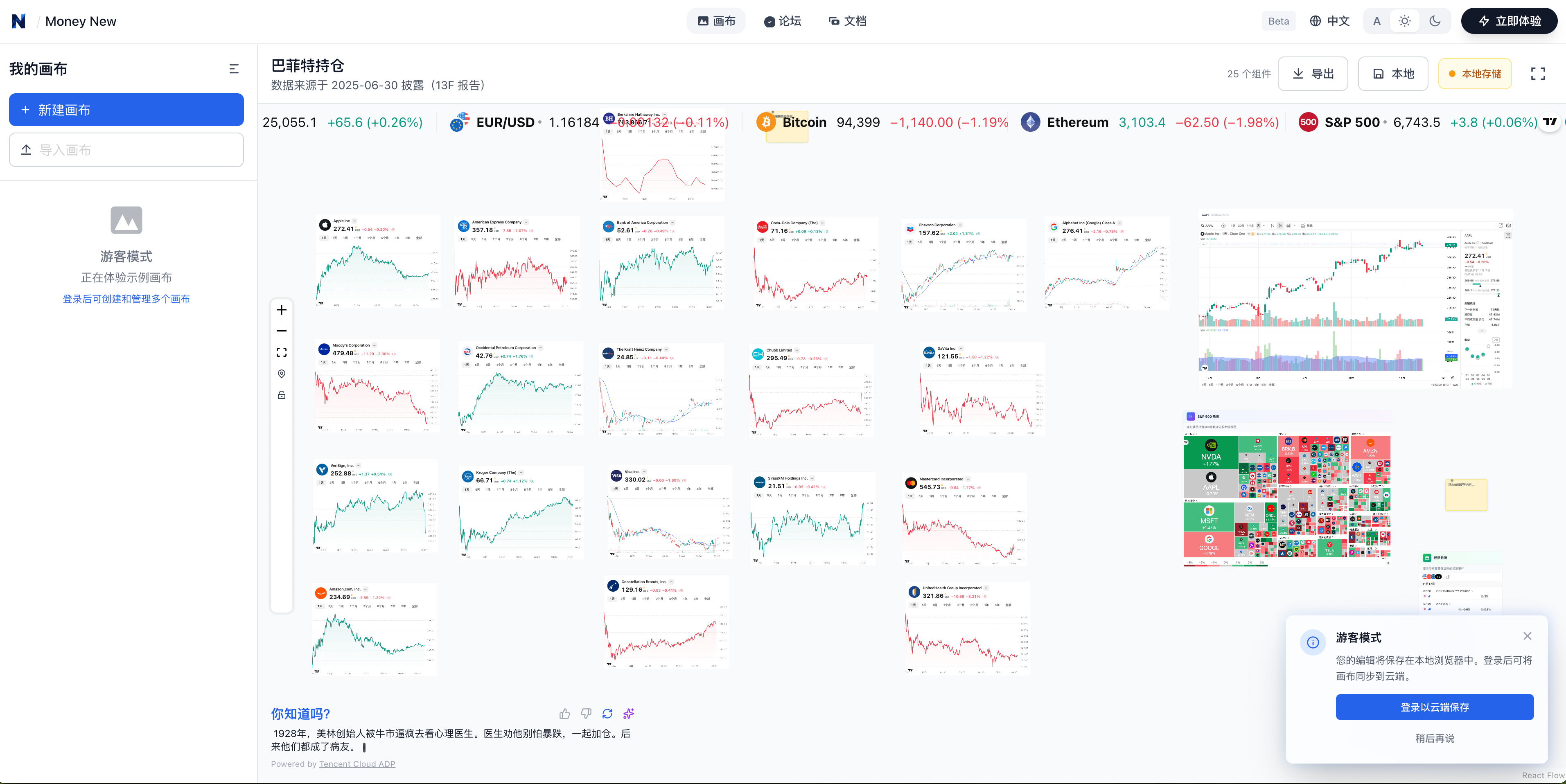 In one sentence, you can view the trends of US stocks, cryptocurrencies, and foreign exchange all on a single canvas. You can even draw lines on the canvas and use the calendar component to check the latest economic data releases. For example, you can intuitively see Buffett's holdings and the historical trend of each stock in his portfolio.