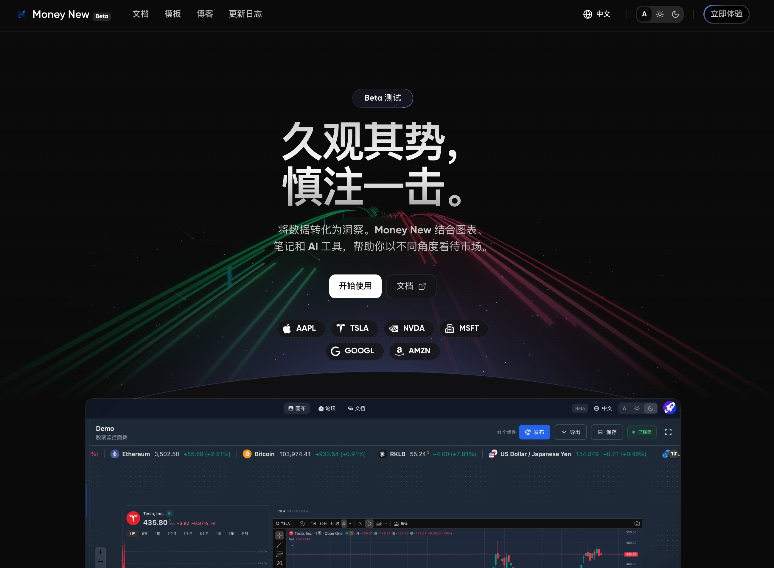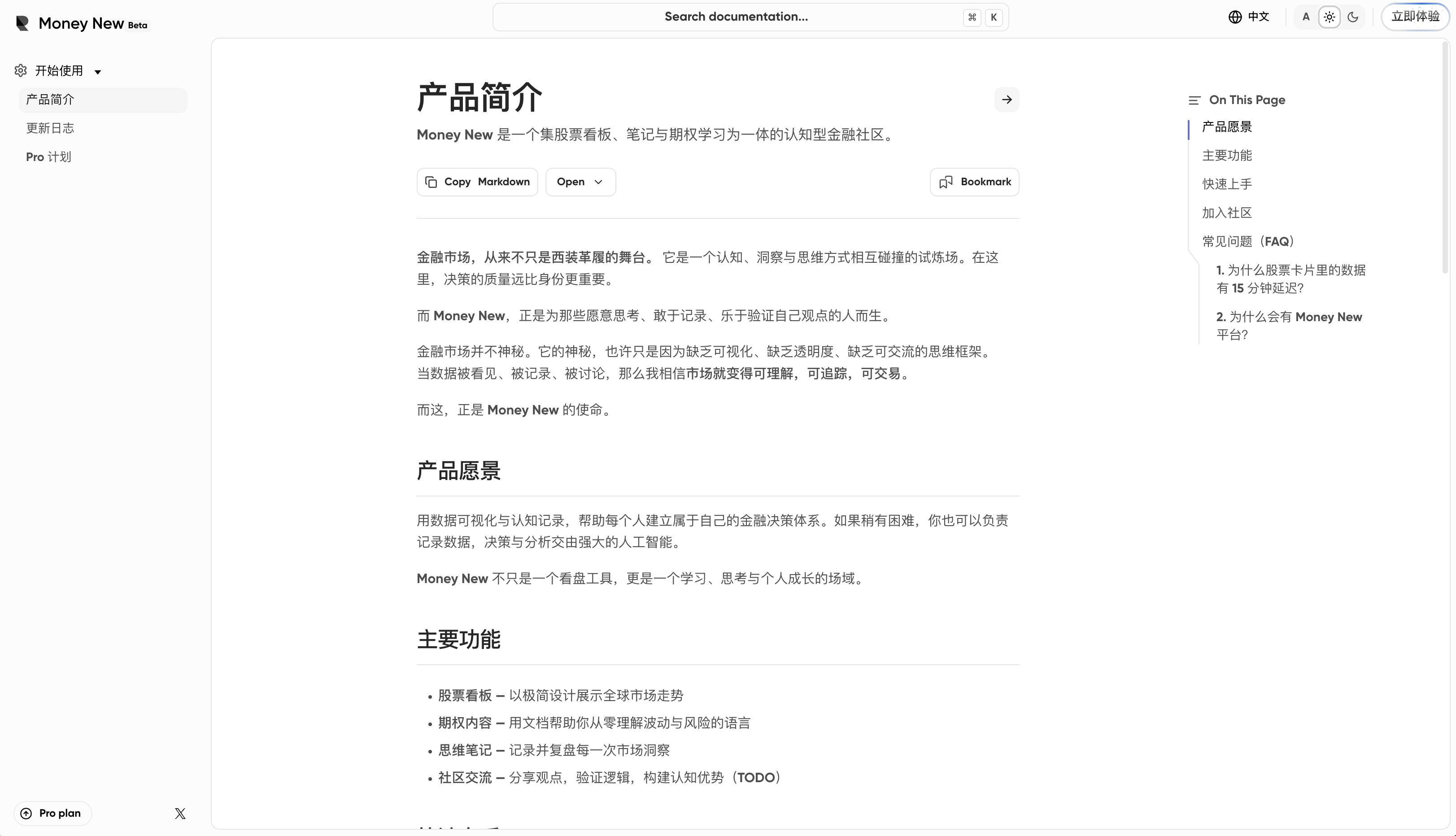 A documentation framework I'm very satisfied with. Powered by fumadocs at its core, it can display rich content. In the future, it may integrate stock cards with the product to help people learn about finance and efficiently visualize data.